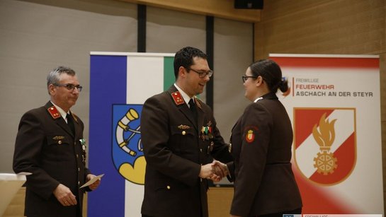 Im Zuge dessen wurde Georg Blumenschein zum Hauptbrandmeister ernannt, da er die Funktion des Atemschutzwarts von BI Rene Havelka übernahm. Agnes Maria Blumenschein wurde als Lotsenkommandantin zum Brandinspektor ernannt und beerbt in dieser Funktion Johann Blumenschein, der nach dreißig Jahren im Kommando der Feuerwehr Aschach aus diesem ausschied und zum Ehren-Hauptbrandinspektor ernannt wurde.